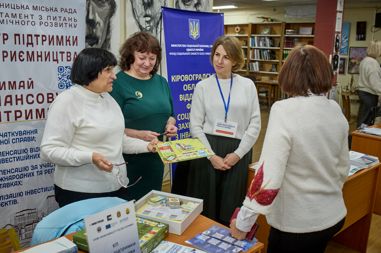 На першому поверсі бібліотеки працювали локації «Простір розвитку твого бізнесу» та «Траєкторія успіху», де ветерани могли дізнатися про можливості професійного навчання, грантові програми, ваучери та сервіси служби зайнятості.