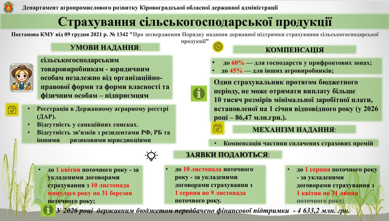 - запуск повноцінного агрострахування: 60 млн грн у держбюджеті, компенсація страхових премій — до 60% для прифронтових територій і до 45% для інших;