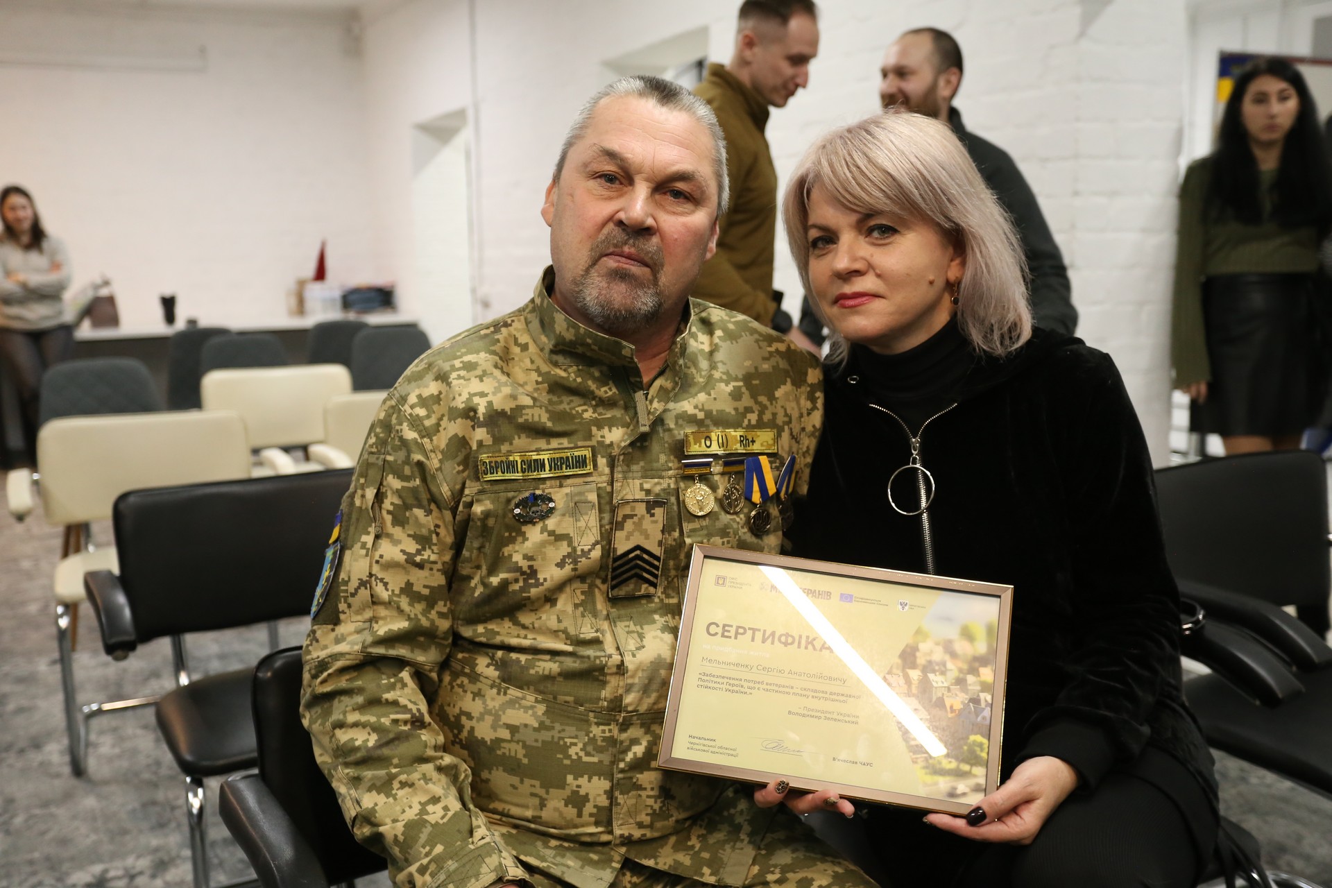 У ветеранському просторі міської ради у Чернігові тринадцятьом ветеранам, які отримали інвалідність І-ІІ групи внаслідок війни, вручили сертифікати на житло. Із родинами захисників зустрілися міністерка у справах ветеранів Наталія Калмикова, начальник ОВА В’ячеслав Чаус і його заступник Іван Ващенко, народний депутат Валерій Зуб.
