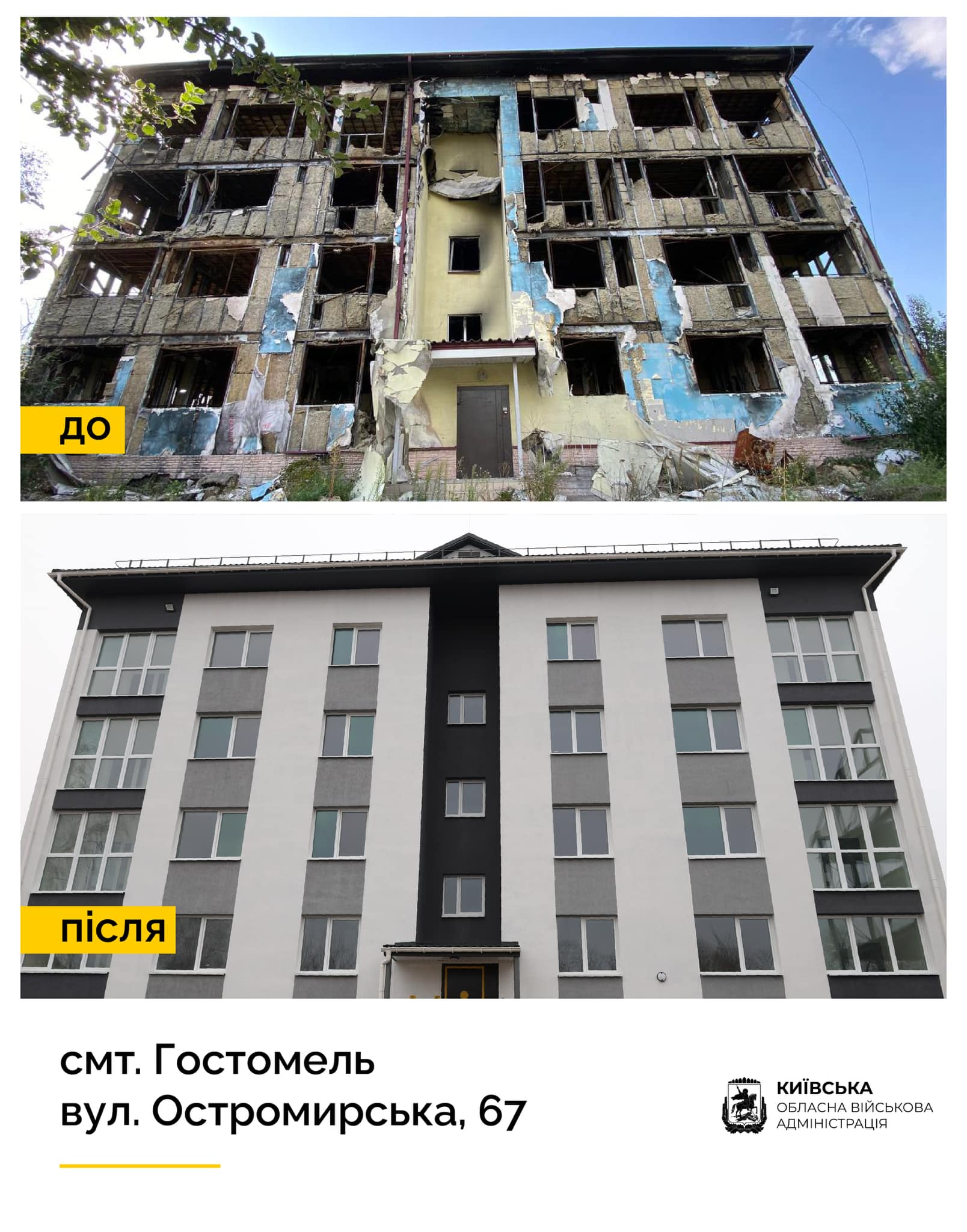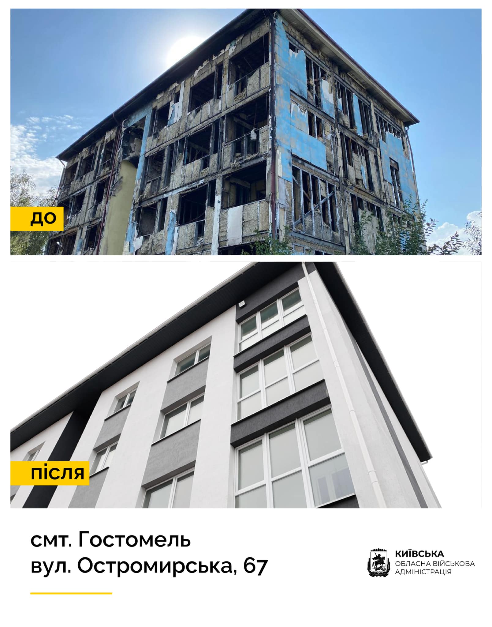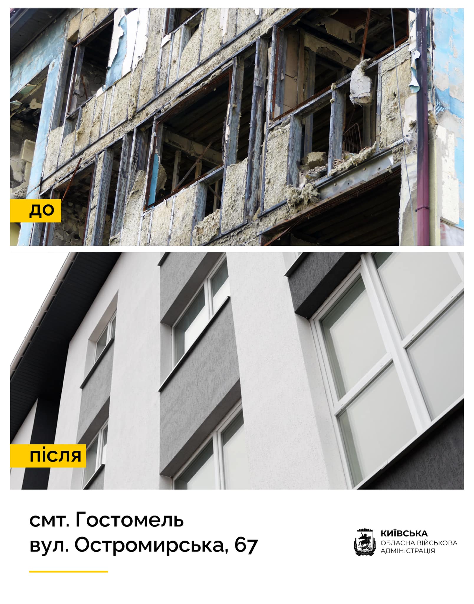 В Гостомелі на вулиці Остромирській, 67 відновили багатоквартирний житловий будинок, зруйнований росіянами. Понад 60 його мешканців нарешті можуть повернутися до своїх осель.